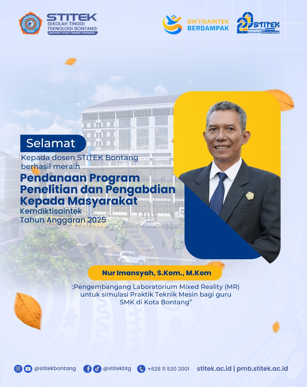 Adapun judul penelitian yang berhasil mendapatkan pendanaan adalah “Pengembangan Laboratorium Mixed Reality (MR) untuk Simulasi Praktik Teknik Mesin bagi Guru SMK di Kota Bontang”. Melalui program ini, diharapkan dapat tercipta sebuah media pembelajaran berbasis teknologi MR yang interaktif, inovatif, dan mampu meningkatkan kualitas praktik teknik mesin di lingkungan SMK. STITEK Bontang terus berkomitmen untuk menghadirkan karya-karya terbaik dan solusi berbasis teknologi bagi kemajuan pendidikan dan masyarakat di Kota Bontang dan sekitarnya.